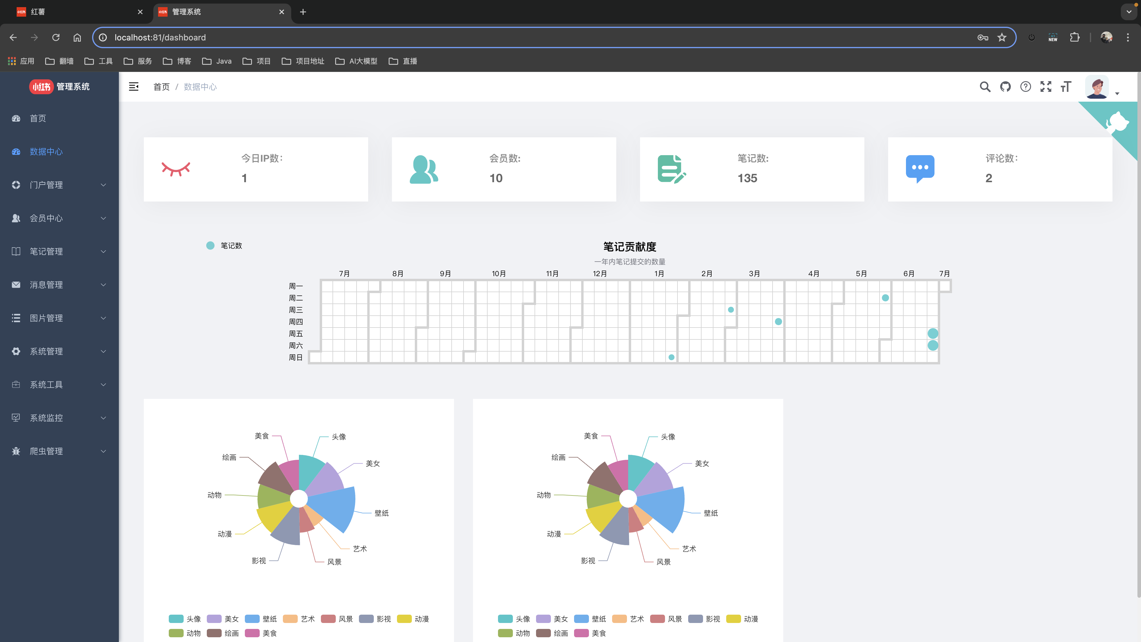 ## 平台简介 * 前端采用Vue3、Element Plus、Ts、Vite。 * 后端采用SpringBoot、SpringSecurity、WebSocket、Redis、ElasticSearch & Jwt。 * 移动端采用uniapp * 权限认证使用Jwt,支持多终端认证系统。 * 支持加载动态权限菜单,多方式轻松权限控制。 * 单应用: [HongShu](https://gitee.com/Maverick_Ma/hongshu) * 网页端,请移步: [HongShu-Web](https://gitee.com/Maverick_Ma/hongshu-web) * 管理端,请移步: [HongShu-Admin](https://gitee.com/Maverick_Ma/hongshu-admin) * 移动端,请移步: [HongShu-App](https://gitee.com/Maverick_Ma/hongshu-app) ## 用户端内置功能 1. 笔记:瀑布流按分类展示笔记,懒加载笔记图片 2. 搜索:使用 ElasticSearch 做关键词搜索高亮查询 3. 动态:展示个人和好友动态 4. 消息:使用 WebSocket 做私信聊天和消息通知,用户发送消息实时通知、消息页面实时展示当前未读消息数量提醒 5. 发布:发布和修改笔记功能,使用七牛云oss对象存储图片 6. 用户信息:展示当前用户发布、点赞和收藏的笔记 7. 双 Token 登录机制、无感刷新,使用 Redis 做对象缓存 ## 管理端内置功能 1. 用户管理:用户是系统操作者,该功能主要完成系统用户配置。 2. 部门管理:配置系统组织机构(公司、部门、小组),树结构展现支持数据权限。 3. 岗位管理:配置系统用户所属担任职务。 4. 菜单管理:配置系统菜单,操作权限,按钮权限标识等。 5. 角色管理:角色菜单权限分配、设置角色按机构进行数据范围权限划分。 6. 字典管理:对系统中经常使用的一些较为固定的数据进行维护。 7. 参数管理:对系统动态配置常用参数。 8. 通知公告:系统通知公告信息发布维护。 9. 操作日志:系统正常操作日志记录和查询;系统异常信息日志记录和查询。 10. 登录日志:系统登录日志记录查询包含登录异常。 11. 在线用户:当前系统中活跃用户状态监控。 12. 定时任务:在线(添加、修改、删除)任务调度包含执行结果日志。 13. 系统接口:根据业务代码自动生成相关的api接口文档。 14. 服务监控:监视当前系统CPU、内存、磁盘、堆栈等相关信息。 15. 缓存监控:对系统的缓存信息查询,命令统计等。 16. 在线构建器:拖动表单元素生成相应的HTML代码。 17. 连接池监视:监视当前系统数据库连接池状态,可进行分析SQL找出系统性能瓶颈。 ## 2.0版本实现功能 1. 添加移动端 2. 重构实现 SpringCloud 微服务架构 3. 加入商城购物功能 4. 加入推荐算法,优化内容推荐和用户推荐功能 5. 使用 MQ+Redis 优化点赞、收藏、浏览功能 6. 支持七牛云、阿里、腾讯、Minio等多种oss对象存储方式 7. 笔记内容支持视频和live图 ### ⚠️如有【项目问题】或【部署需求】可联系微信:coder_xiaomage ## 演示站(2.0版) - web端 ➡️ [点我体验](http://47.95.205.22) - admin端 ➡️ [点我体验](http://47.95.205.22/admin/) - app端 ➡️ [点我体验](http://47.95.205.22/app/) - 文档及资料会暂时放到我的个人博客:[点我进入](https://mayongjian.cn) * 由于服务器资源有限,首次加载可能缓慢一些。 * 同时为优化服务器也感谢小伙伴们打赏支持❤️。 ## 视频演示 ➡️ [点击查看](https://www.bilibili.com/video/BV1QP8dekEGq/?spm_id_from=333.999.list.card_archive.click&vd_source=ec9224821314432ac6e12dc7d500d74b) ## 演示图 ### - web端: